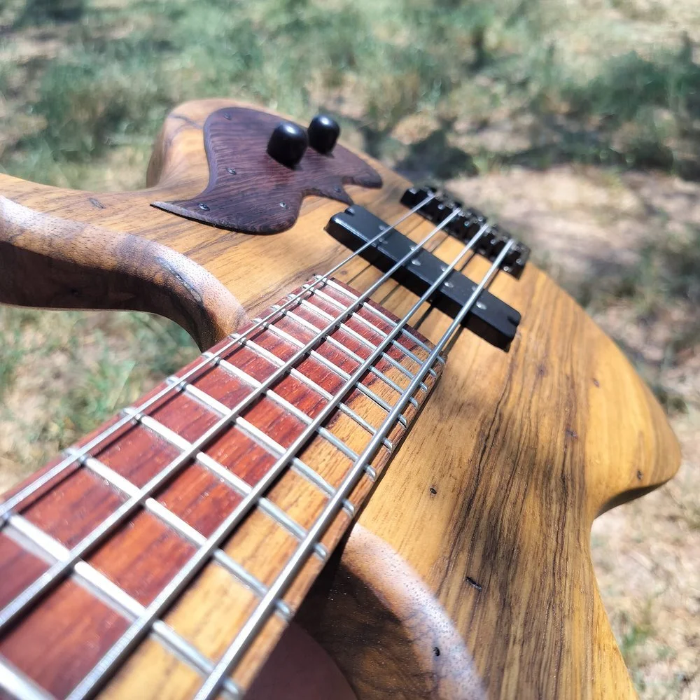 Recipe: The body of our C-5 model, wider P-width nut, full 19 mm string spacing at bridge (other Birdsongs are 17.5 mm), and the single pickup in a harmonically rich spot is a high output version of our favorite humbucking soapbar - full range, high fidelity, but spiced up with a kick. Extremely versatile just by vol. and tone adjustments, with a good solid tone.